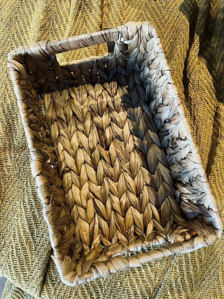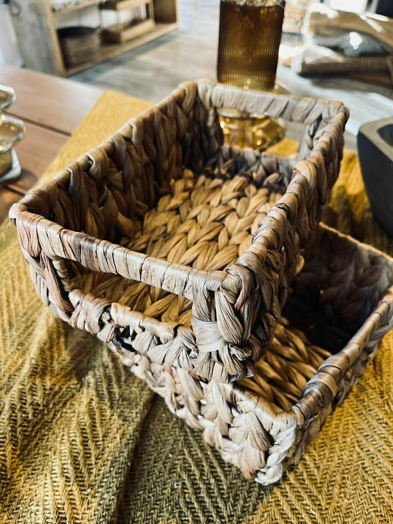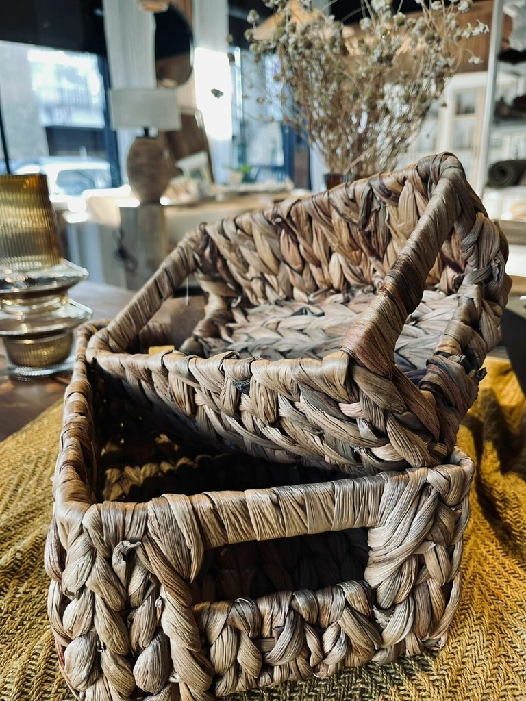 Canasto rectangular de hoja de banano con manija. Posibilidad de combinar con el mismo de un tamaño mas chico.