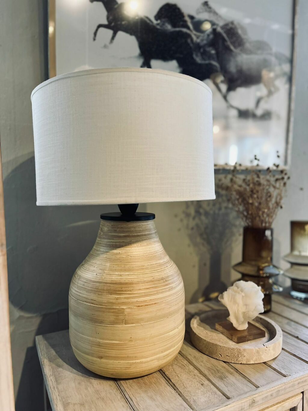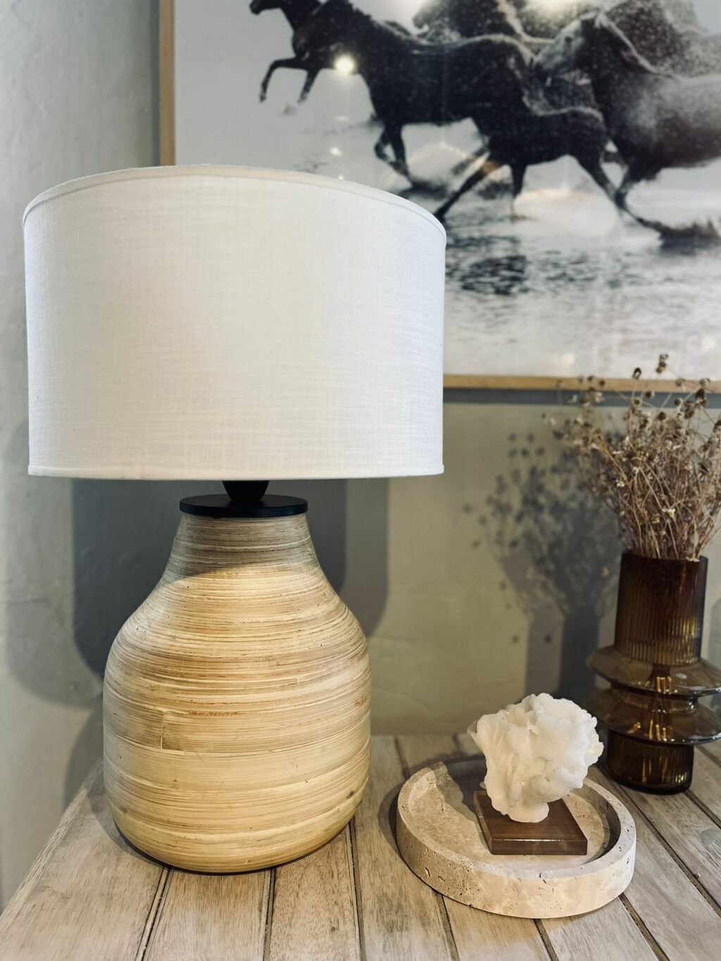 Lámpara de mesa / Velador forrado en fibras naturales con pantalla de lienzo blanco de 35 x 20
